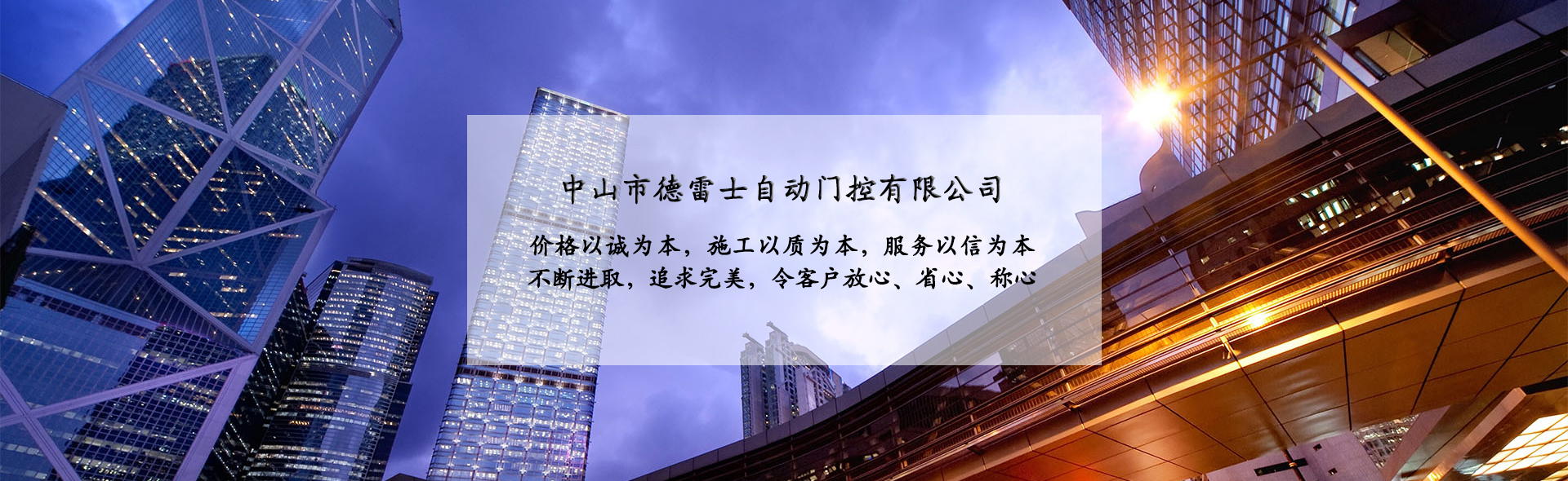 中山市德雷士自動(dòng)門(mén)控有限公司代理中山松下自動(dòng)門(mén)、中山松下感應(yīng)門(mén)、及其旗下品牌松下(Panasonic)自動(dòng)門(mén)、旋轉(zhuǎn)門(mén)、型材門(mén)、松下門(mén)禁系統(tǒng)、地彈簧、閉門(mén)器等系列產(chǎn)品。 松下Panasonic一直致力于憑借不斷創(chuàng)新的技術(shù)營(yíng)造為各個(gè)區(qū)域的用戶做出最佳解決方案,在自身領(lǐng)域處于領(lǐng)先地位;松下自動(dòng)門(mén)控系統(tǒng)廣泛應(yīng)用于寫(xiě)字樓、機(jī)關(guān)單位、大型企業(yè)、學(xué)校、醫(yī)院、智能小區(qū)等領(lǐng)域。在用戶心中有良好的口碑及信譽(yù)度。 松下(Panasonic)自動(dòng)門(mén)控系統(tǒng)包含:自動(dòng)感應(yīng)門(mén)、旋轉(zhuǎn)門(mén)、90度平開(kāi)門(mén)、圓弧型門(mén)、重疊門(mén)、緊急逃生門(mén)、醫(yī)用門(mén)、氣密門(mén)、鋁合金型材門(mén)、松下門(mén)禁系統(tǒng)、家庭智能鎖、地彈簧、閉門(mén)器等系列產(chǎn)品。 德雷士自動(dòng)門(mén)控有限公司從事智能門(mén)控十余載,精英匯聚;公司具有完善的管理體系,對(duì)每位客戶都進(jìn)行檔案管理,跟蹤服務(wù),定期回訪,終生維修。提供急修12小時(shí)解決,一般維修48小時(shí)解決的服務(wù),完全能解決您的后顧之憂。 公司的質(zhì)量方針 科學(xué)管理確保的工程質(zhì)量 真誠(chéng)服務(wù)贏得客戶信譽(yù) 持續(xù)創(chuàng)新打造企業(yè) 公司的服務(wù)宗旨 價(jià)格以誠(chéng)為本,施工以質(zhì)為本,服務(wù)以信為本。 實(shí)實(shí)在在做人,老老實(shí)實(shí)做事,以我們的辛苦換來(lái)客戶滿意的微笑,這就是我們的追求! 公司的目標(biāo) ...